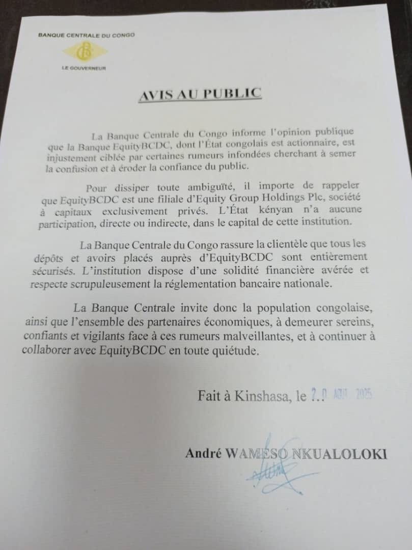Une partie de ce document, daté du 20 août 2025, annonce que “La Banque centrale du Congo informe l’opinion publique que la Banque Equity BCDC, dont l’État congolais est actionnaire, est injustement ciblée par certaines rumeurs infondées cherchant à semer la confusion et à éroder la confiance du public. Pour dissiper toute ambiguïté, il importe de rappeler que Equity BCDC est une filiale d’Equity Group Holdings Plc, société à capitaux exclusivement privés. L’État kényan n’a aucune participation, directe ou indirecte, dans le capital de cette institution. La Banque centrale du Congo rassure la clientèle que tous les dépôts et avoirs placés auprès d’Equity BCDC sont entièrement sécurisés. L’institution dispose d’une solidité financière avérée et respecte scrupuleusement la réglementation bancaire nationale (…)”.