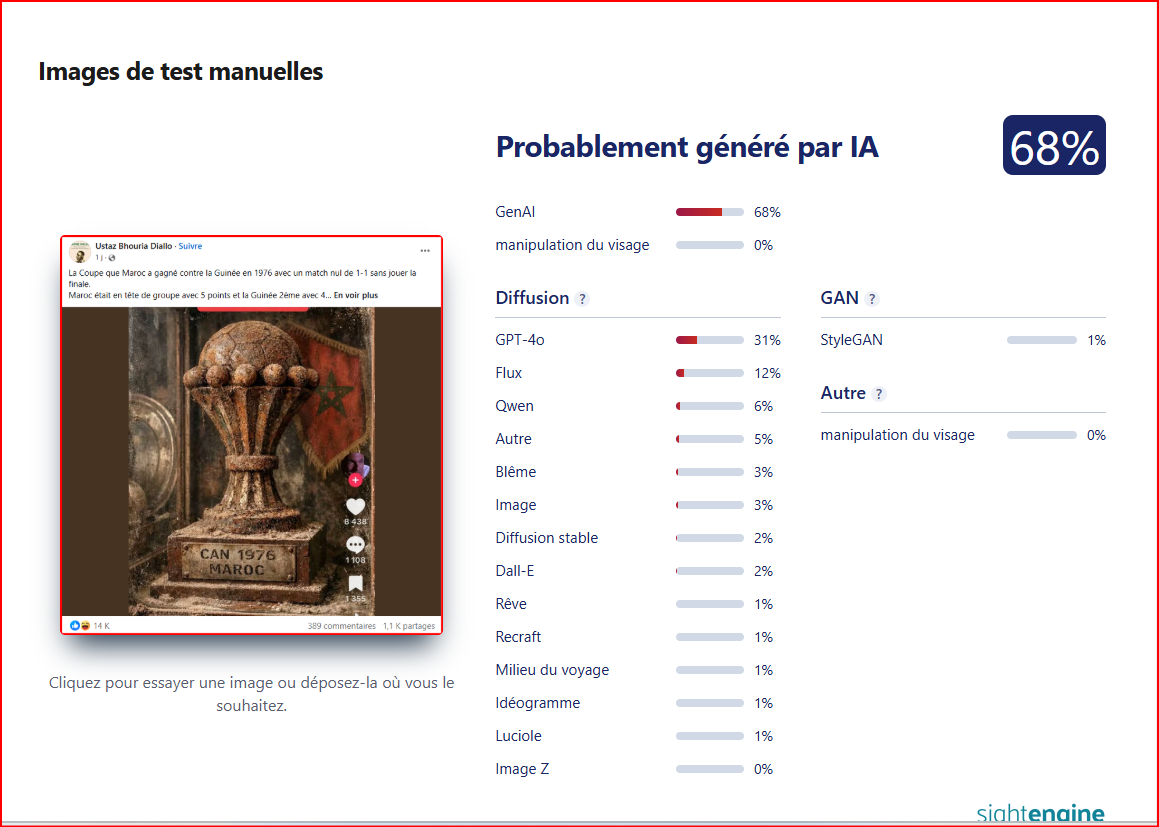 Et d’après l’outils sightengine, l’image de vérification est probablement générée par l’IA, à 68%.