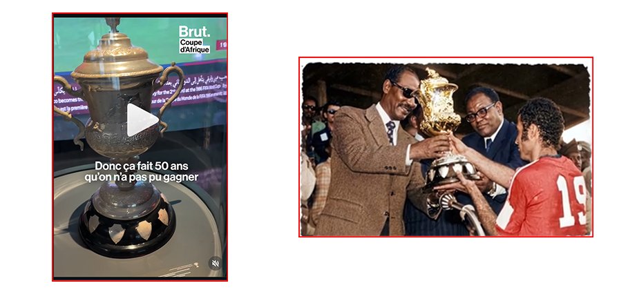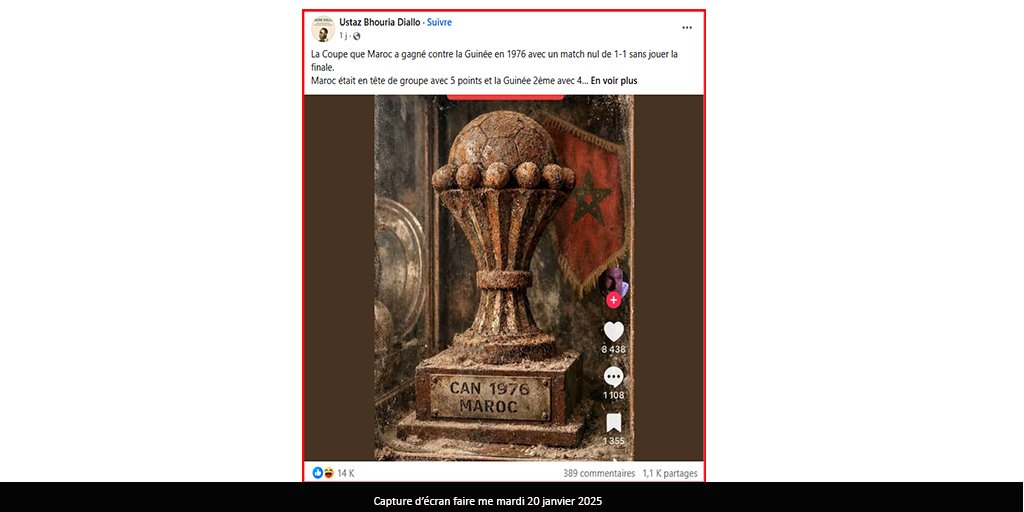L’image d’un trophée semblable à celui de la Coupe d’Afrique des Nations (CAN), dont l’aspect est assez vétuste sur lequel est inscrit : « CAN 1976 MAROC » n’est pas l’image de la coupe remportée par ce pays. Une recherche Osint a permis de retrouver les clichés de la coupe de cette année-là. Illustrations ci-dessous.