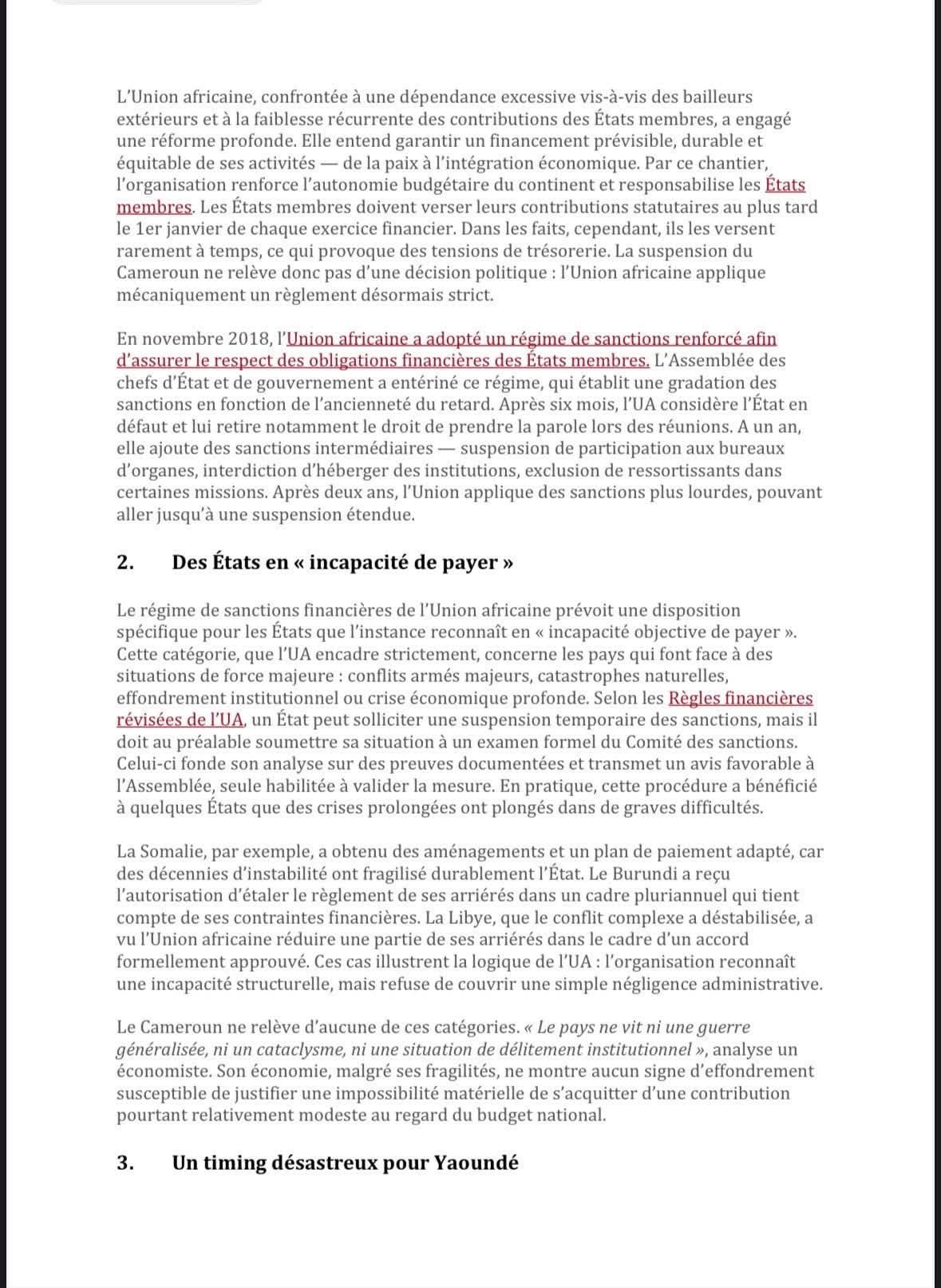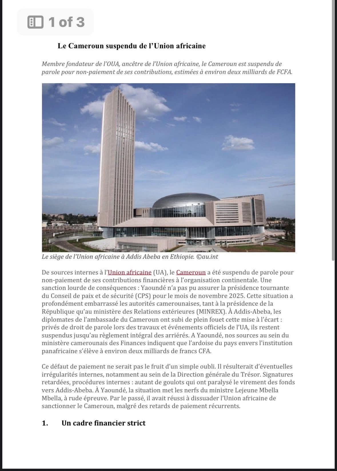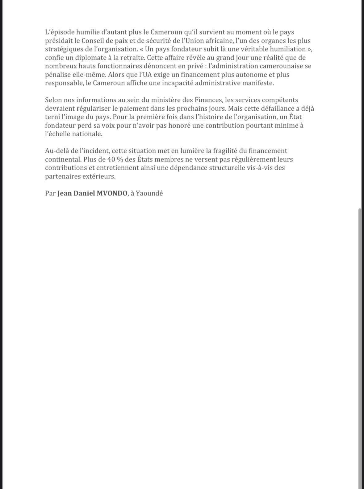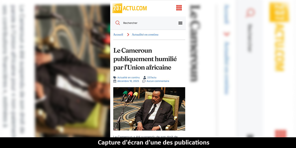Lundi 15 décembre 2025, l’information selon laquelle le Cameroun est suspendu de prise de parole à l’Union africaine (UA) pour non payement des arriérés de cotisations statutaires à hauteur de deux milliards provoque un tollé au sein de l’opinion publique. La nouvelle est publiée sur plusieurs comptes et pages Facebook notamment (1, 2, 3) et reprise par des sites et des agrégateurs de contenus (1, 2, 3, 4…). La plupart de ces publications ont pour source, un texte(1,2,3) signé par Jean Daniel Mvondo.