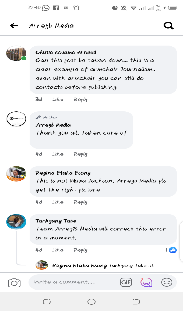 It would appear Laarry Uchenna whose picture has been used wrongly is not taking this lightly as he recently uploaded a post on his facebook page LAARRY’S NEWS ROOM with a picture of Arrey Bate with the Caption “Wanted” to access the link however, you must be granted permission.