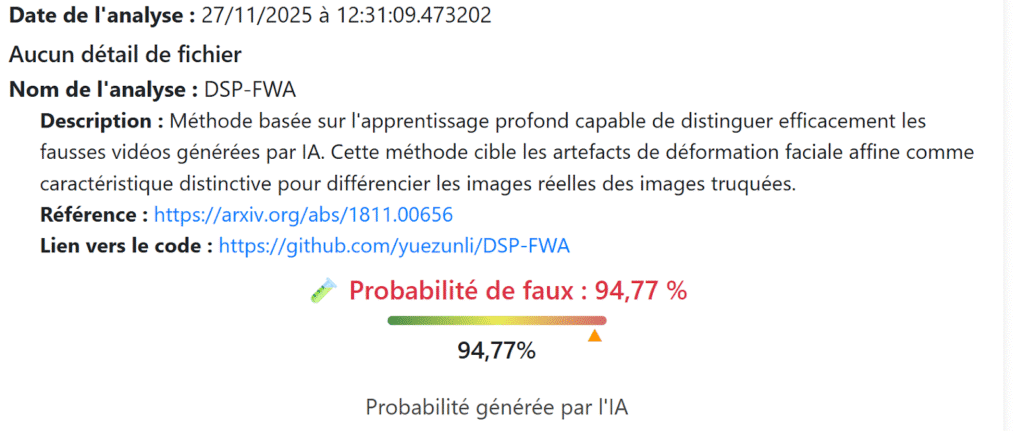 Pour pousser la recherche, nous avons soumis le clip au logiciel “Deepfake-O-Meter”. Ses résultats démontrent à 94,77% que la vidéo sous examen contient des modifications et donne ce détail : “Le score de vraisemblance obtenu par la méthode indique la probabilité que l’entrée soit fausse. Ce score reflète la mesure dans laquelle l’entrée partage des caractéristiques avec les données réelles ou fausses étiquetées dans l’ensemble d’entraînement de la méthode, comme indiqué dans l’étude originale et étayé par des statistiques de corrélation”.