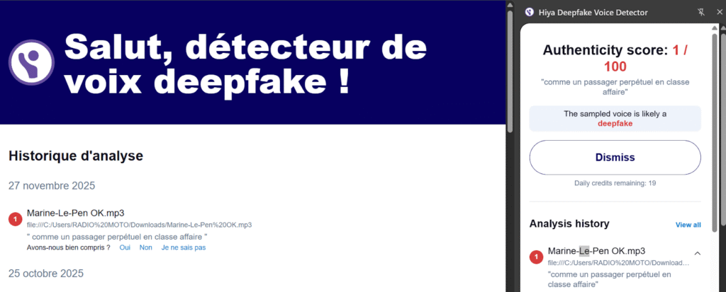L’outil “Hiya Deepfake”, lui, renseigne que l’audio de la vidéo que nous vérifions est inauthentique. “La voix échantillonnée est probablement un deepfake”, rapporte-il.