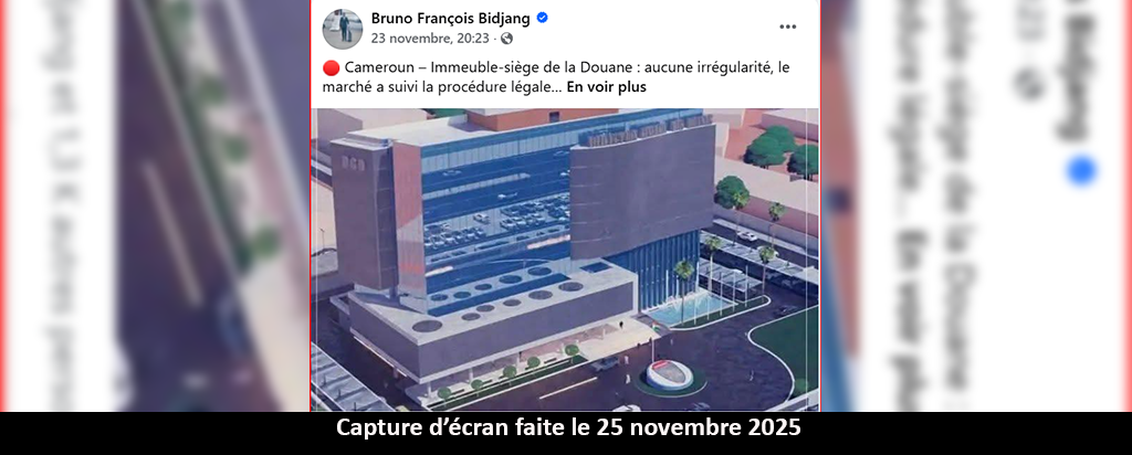 Datée du dimanche 23 novembre 2025, cette publication(archivée ici) devenue virale qui met en relief les recettes budgétaires des Douanes camerounaises survient au moment où l’adjudicataire de la construction du nouvel immeuble siège des Douanes camerounaises à Yaoundé fait débat. D’une durée d’exécution de 42 mois, soit environ 3ans 5 mois, ce marché a été attribué à China Machinery engineering corporation (CMEC) Sarl, une entreprise industrielle et commerciale chinoise fondée en 1978.